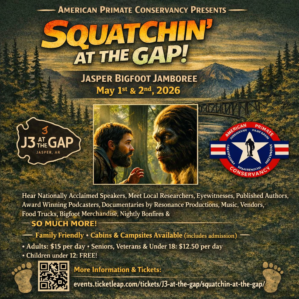 Get ready for an unforgettable weekend in the Ozarks at J3 at the Gap, celebrating the mystery and legend of Bigfoot! Squatchin’ at the Gap brings together nationally recognized speakers, researchers, filmmakers, podcasters, and eyewitnesses for two exciting days of stories, discovery, and family-friendly fun.